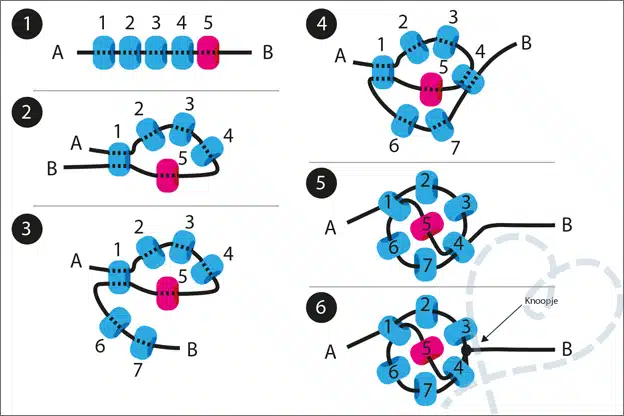 - Rijg nu nog twee kralen (bloemblaadjes) en steek het draad door de het vierde blaadje.